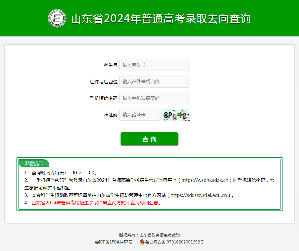 山东省内普通高考招生录取工作由山东省教育招生考试院统一组织,在山东省2024年普通高等学校招生考试信息平台(网址https://wsbm.sdzk.cn/)填报志愿,统一投档录取,录取结果在考试院官方网站查询(网址https://cx.sdzk.cn/GKLQ/),志愿填报及录取查询平台界面如下所示。