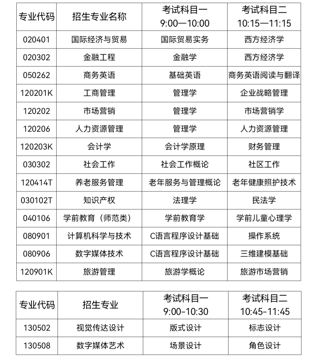 每专业考试科目包含两科,每科目满分100分,各专业考试科目及时间具体安排如下: