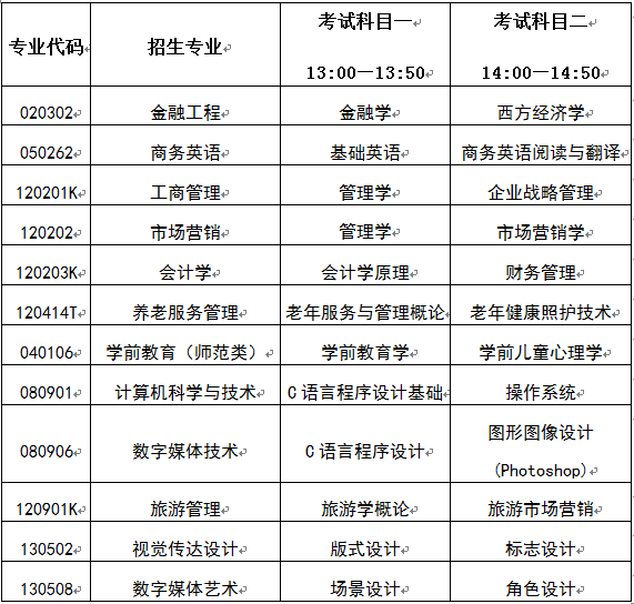 须参加综合考查的退役大学生士兵考生(以下简称考生)。首轮志愿须进行综合考查专业:金融工程、学前教育(师范类)、商务英语、计算机科学与技术、数字媒体技术、工商管理、市场营销、会计学、养老服务管理、旅游管理、视觉传达设计、数字媒体艺术。