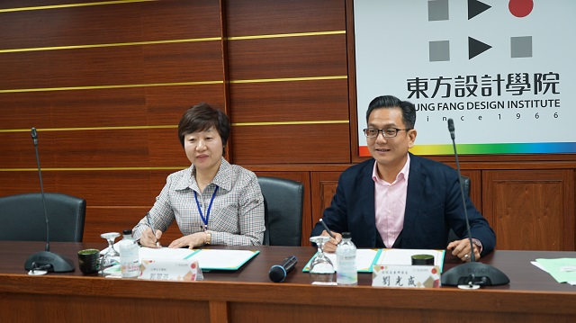 在东方设计学院,副校长刘光胜等校领导及艺术设计学群长、美术工艺研究所所长和影视艺术系教师与代表团举行了亲切座谈,刘光胜从办学思路、管理机制、人才培养、校园建设和国际及两岸交流等方面详细介绍了东方设计学院的办学经验。双方在学生交流、教师讲学、师资培养、合作研究等领域达成若干共识,并草签了合作协议。在刘光胜的全程引领下,代表团参观了东方校友艺术设计百人联展、影视艺术系、流设展廊、美工系展廊、原武典典藏馆、室内设计系、福田繁雄设计艺术馆、台湾设计史研究室等。