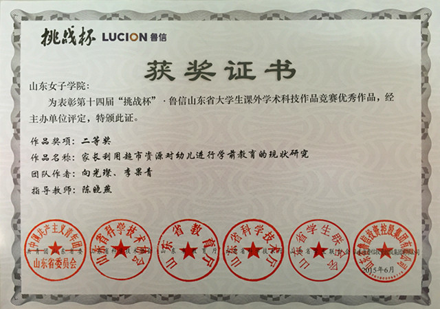 近日,由团省委、省科协、省教育厅、省科技厅、省学联及鲁信集团共同主办,山东师范大学大学承办,鲁信创投协办的第十四届“挑战杯”·鲁信山东省大学生课外学术科技作品竞赛决赛落下帷幕。我校学生向光璨、李果青的作品《家长利用超市资源对幼儿进行学前教育的现状研究》荣获省级二等奖。