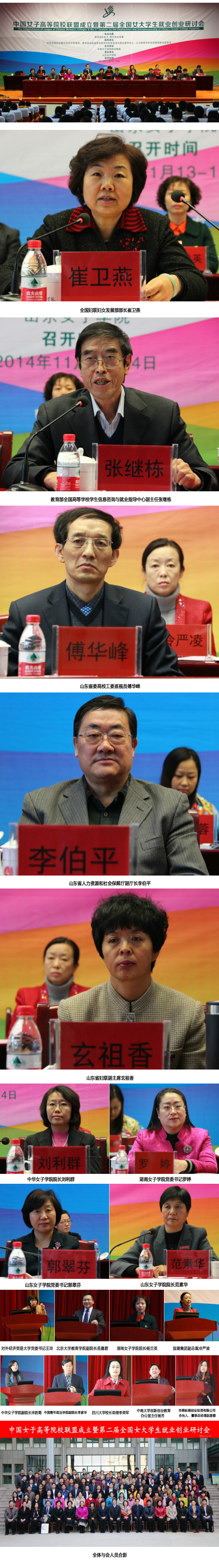 2014年11月13-14日,中国女子高等院校联盟成立大会暨第二届全国女大学生就业创业研讨会在山东女子学院隆重举行。全国妇联党组副书记、副主席、书记处书记孟晓驷发来贺信,全国妇联妇女发展部部长崔卫燕、教育部全国高等学校学生信息咨询与就业指导中心副主任张继栋出席开幕式并讲话,山东省委高校工委巡视员傅华峰、山东省人力资源和社会保障厅副厅长李伯平、山东省妇联副主席玄祖香出席开幕式。中华女子学院院长、中国女子高等院校联盟理事长刘利群致辞,我校党委书记郭翠芬致欢迎辞,院长范素华主持开幕式。