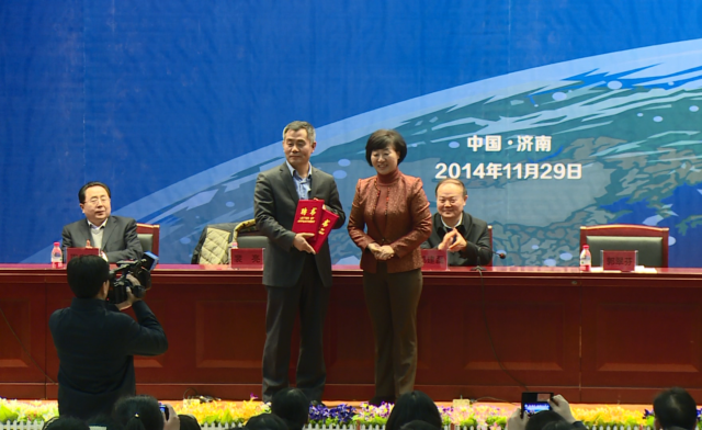 学校党委书记郭翠芬为裴亮秘书长颁发山东女子学院连锁经营管理学院名誉院长和山东女子学院客座教授聘书