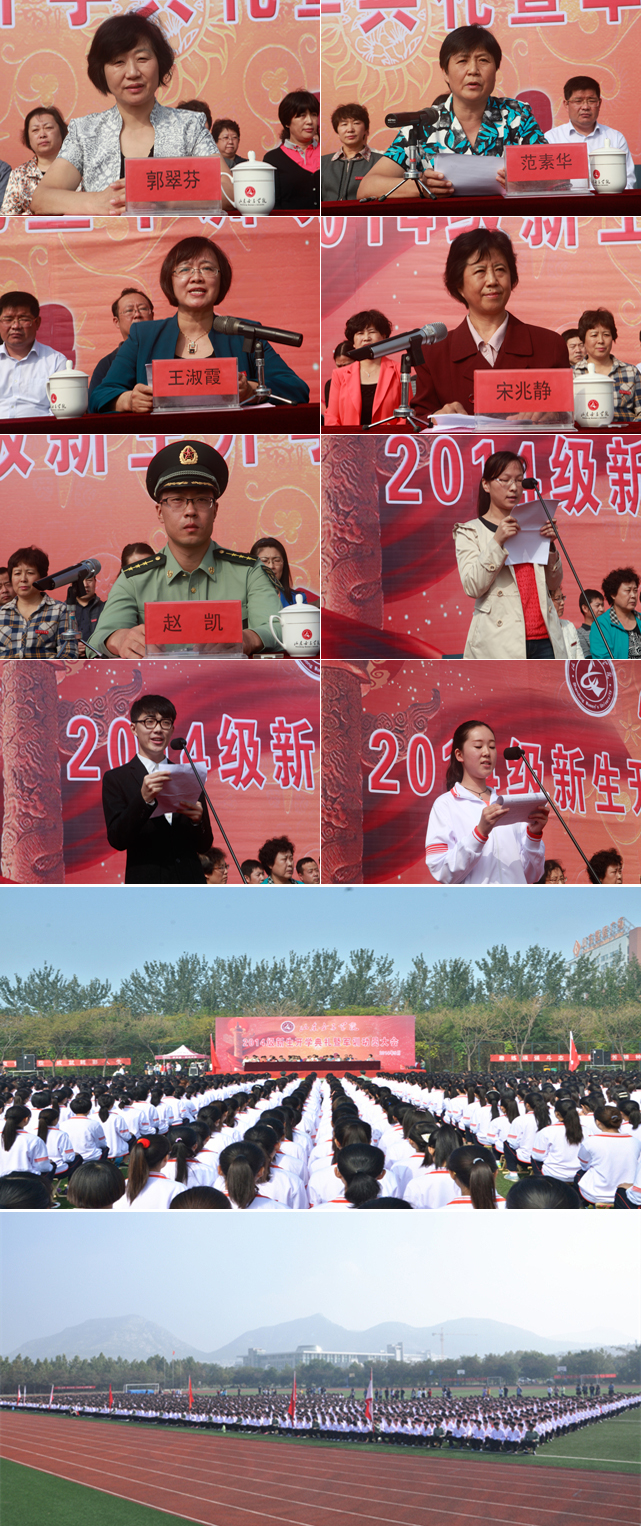 金色九月,秋风送爽。9月19日上午,学校2014级新生开学典礼暨军训动员大会在田径场隆重举行。学校领导郭翠芬、范素华、王淑霞、宋兆静、汪琦、贺兴利和中国人民解放军71939部队58分队指导员赵凯出席了大会,全体教官、各部门、各单位负责人、2014级全体新生及教师和高年级学生代表参加了大会。大会由副院长宋兆静主持。