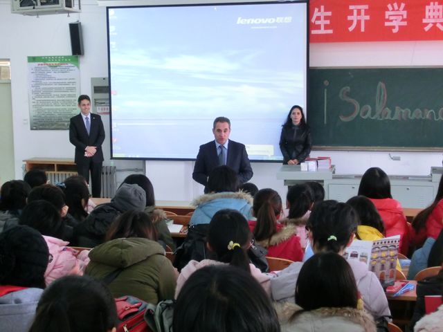 座谈结束后,代表团与我校应用西班牙语专业学生进行了交流和互动,代表团通过视频向学生介绍了萨拉曼卡市以及萨拉曼卡主教大学的情况,并回答了学生提出的问题。