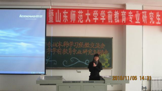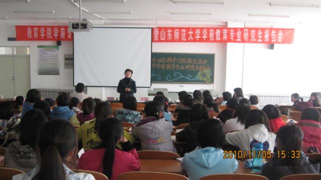 同时,为了增进学生对所学专业的了解,使其更好地适应大学学习生活,此次报告会我们特邀了山东大学幼教发展中心的张卫东主任、山东师范大学研究生施桂红同学、专科生代表于娜同学等,进行了一次场面异常热烈的学习经验交流会。我院本科生导师、来自山大幼教发展中心的张卫东主任,以从事幼教行业近三十年的亲身经历,向同学们展示了幼教事业的巨大魅力,为我们更深入地解读了学前教育的专业内涵与其乐观的就业前景,使同学们对学前教育这个专业有了亲切的体会,也坚定了同学们学好专业、从事幼教行业的决心。施桂红同学做了“大学生涯规划,走近学前教育”的报告,为同学们讲解了如何走进学前教育专业和该专业良好的发展现状,介绍了学前教育专业研究生教育的情况,重点对大学生的学习规划,生活规划,技能发展三个方面做了全面指导。专科生代表于娜同学向大一新生介绍了学前教育课程的学习方法。