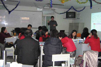 金蝶软件(中国)有限公司济南分公司的培训教师给工商管理系教师讲授沙盘操作原理