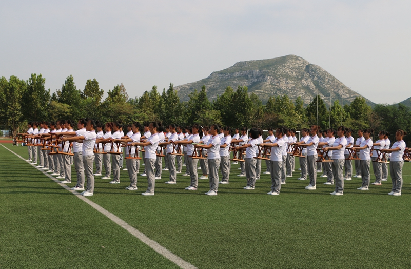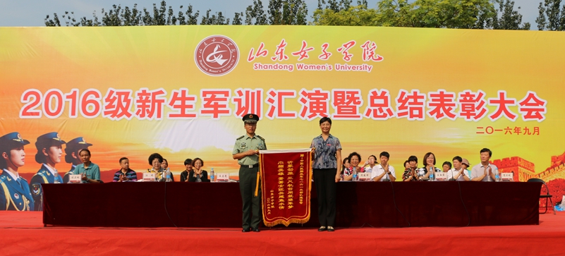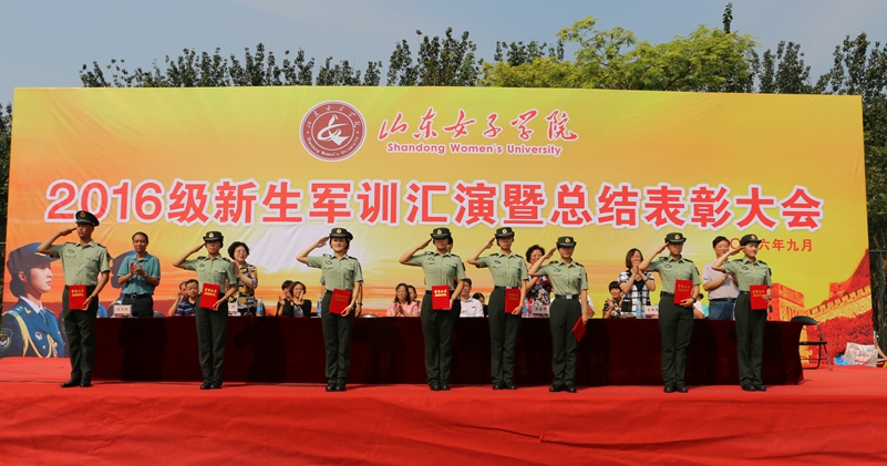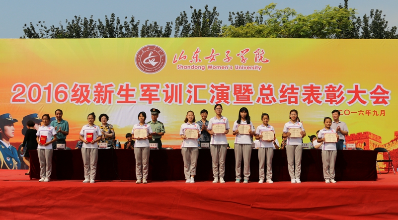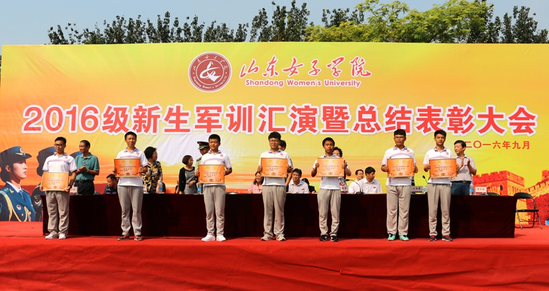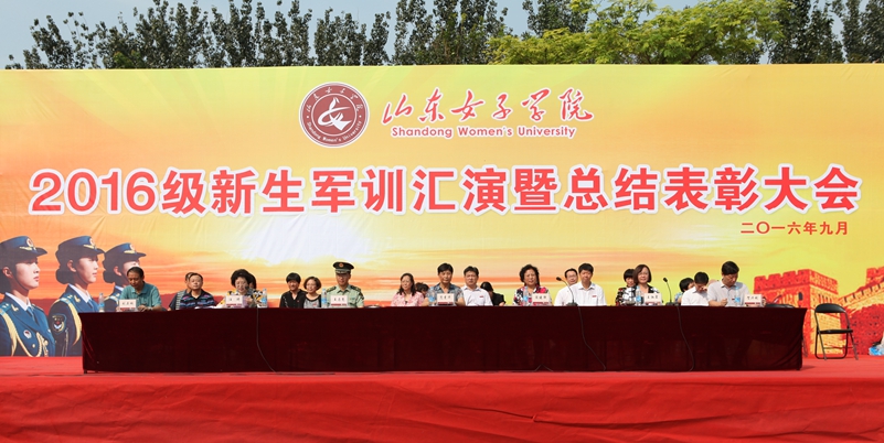 大会在雄壮的国歌声中拉开帷幕。校长范素华在阅兵总指挥的陪同下检阅了新生军训连队。分列式上,由全体新生组成的26个连队方阵在教官的指挥下依次走过主席台,展示他们的训练成果。分列式结束后,女生6连和男生连队分别进行了养成表演、军体拳表演,整齐划一的步伐、刚劲有力的动作赢得了阵阵掌声。范素华向承训部队赠送了锦旗。纪委书记汪琦宣读了《山东女子学院关于表彰2016级新生军训先进集体和个人的决定》,对获奖的8名优秀教官、8个先进连队、83个优秀宿舍和91名先进个人进行了表彰。社会与法学院2016级社会工作专业王子璇同学代表全体新生发言。