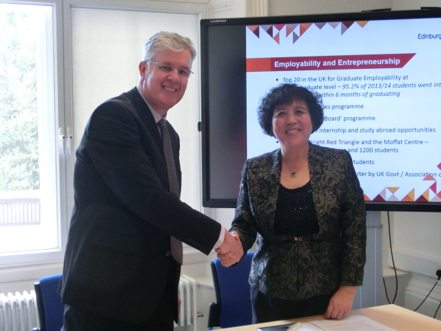 在爱丁堡龙比亚大学,宿建沛书记一行同国际交流处负责人Naomi Graham及商学院院长James O’Kane、商学院学科带头人James Brown进行了友好的交流。Naomi对代表团的来访表示热烈欢迎。双方首先相互介绍了各自学校近年来的办学情况,本科人才培养及国际化交流情况。两校在办学理念,本科人才培养,专业设置等领域有着许多的共同点,在许多学科领域存在着合作的潜能。随后,两校就学生交流,“3+1”合作办学项目、教师互访、教师培训等方面交换了意见,签署了合作备忘录。