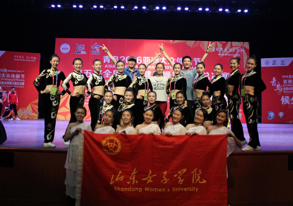 2016年9月20-25日,2016亚洲大众体操节暨第五届全国全民健身操舞大赛总决赛在青岛大学举行,来自芬兰、澳大利亚、日本、韩国、中国香港等200多个国家和地区的8500多名运动员参加了比赛。我校代表队因在山东赛区比赛中表现优异,获得了代表山东参加本次全国总决赛的资格。本次比赛,我校代表队再接再厉,在所参加的八个项目中共获得特等奖四项,一等奖两项,二等奖两项。由于成绩突出,我校代表队还代表山东与中国国家健美操队、国家技巧队以及来自其他国家的健身操舞代表队一起参加了本次赛事最高水平的GALA展演盛典的演出。