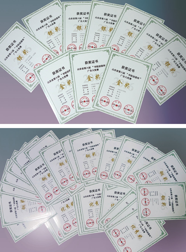 近日,山东省第六届“学院创意杯”广告大奖赛评比揭晓。学校视觉传达设计专业学生在本次比赛中喜获佳绩,获得金奖3项、银奖7项、铜奖22项、优秀奖17项。山东女子学院等十所院校的作品创作质量高,组织工作突出,获组织奖。
