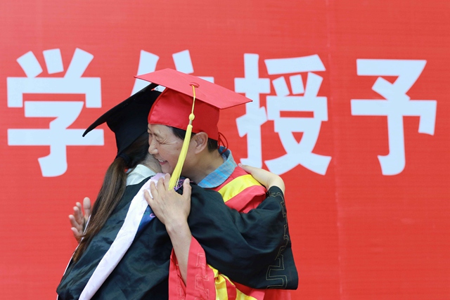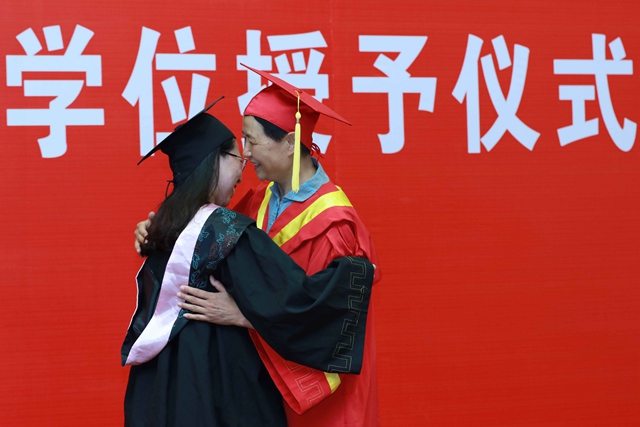 范素华对毕业生们顺利完成学业表示热烈祝贺,同时希望同学们要强化爱校如家的意识,在工作岗位上迅速脱颖而出,以优异的成绩向母校报喜;要珍惜学校声誉,支持学校建设,以出色的表现为母校增光。她表示,无论走到哪里,女院永远都是是同学们的家,母校会时时牵挂着大家、关注着大家、激励着大家,希望同学们常回家看看。合影留念活动中,身着校长服的范素华与每一位身着学士服,头戴学士帽的毕业生亲切握手,扶正流苏、合影留念。毕业生们更是情不自禁地与范校长拥抱甚至亲吻,来表达对母校和老师的难舍之情。