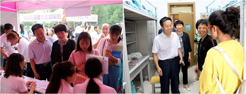 学校校长盛国军、党委副书记宿建沛、副校长侯素美来到学生注册处、各学院报到处、公寓等迎新点,检查迎新工作情况,看望前来报到的新生及其家长。校领导与新生和家长亲切交谈,对新生表示热烈欢迎,同时慰问了现场工作人员和大学生志愿者。学校相关部门负责人一同来到迎新现场。
