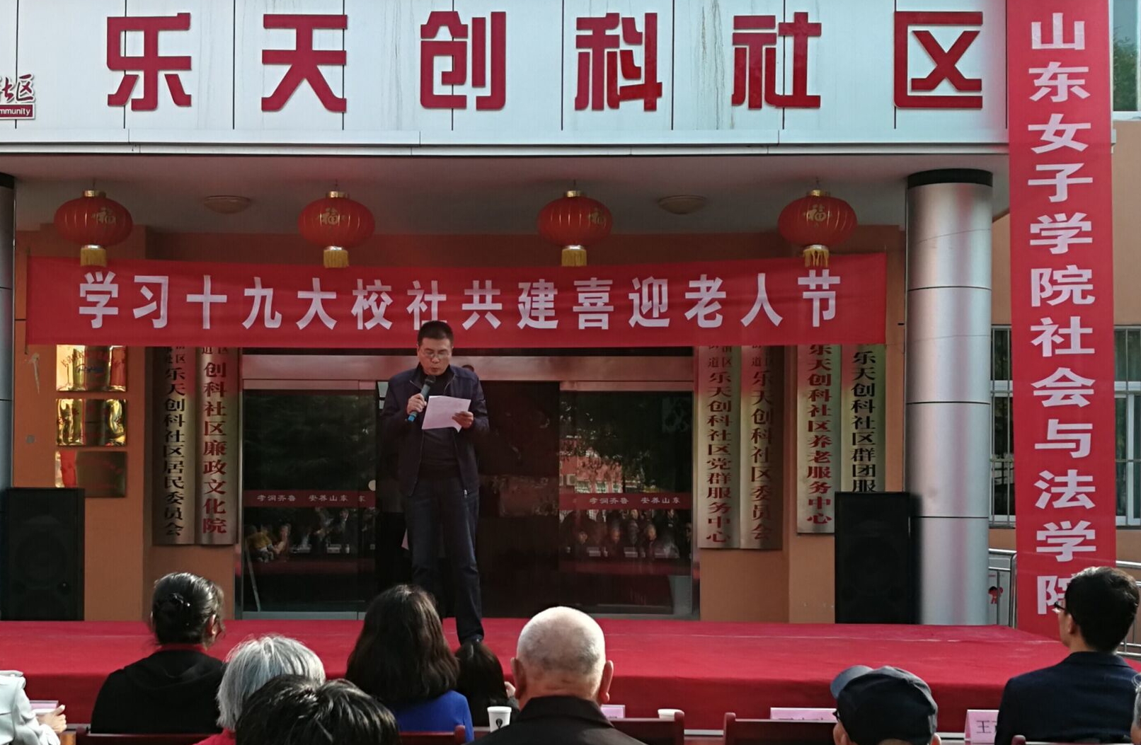 活动伊始,首先由乐天创科社区党总支书记石先玮致辞,石书记对山东女子学院师生的敬老爱老行为表示感谢。社会与法学院相关负责人代表老年服务与管理专业师生向老人们表达了节日的问候与祝愿。