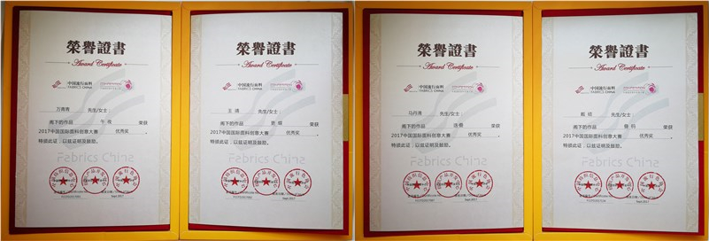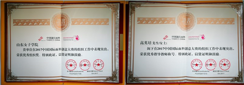 近日,由中国纺织工业联合会主办,中国纺织信息中心、国家纺织产品开发中心、中国流行色协会等权威机构共同承办的“2017中国国际面料创意大赛”结果揭晓,我校15级服装与服饰设计专业戴硕、马丹清、万青青、王靖四名同学的参赛作品,在全国20多所高校和百余家企业3000余份花型设计作品中脱颖而出均获得优秀奖,学校荣获优秀组织奖,艺术学院高英培老师积极组织、指导学生参赛,荣获组委会颁发的“优秀指导教师”称号。