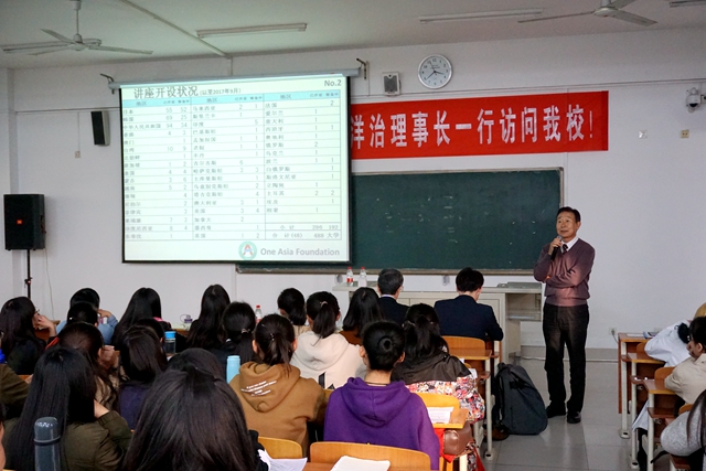 刘正林代表学校对客人的到来表示欢迎,并简要介绍了我校的基本情况。佐藤理事长对学校的热情接待表示感谢,并介绍了亚洲共同体组织的活动原则及讲座开设情况。双方希望以此次活动为契机,加强合作、携手共进,为中日文化交流搭建友谊的桥梁。会谈结束后,佐藤理事长到博文楼307教室,为外国语学院的师生做了题为“世界终将融为一体”的讲座。