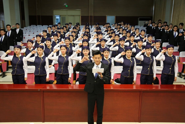 近日,旅游学院在图书馆一楼报告厅举行2017级空中乘务专业学生授服仪式。学校学生处、招生就业处、旅游学院相关负责人和东方领航教育集团负责人,以及2017级空中乘务专业全体学生参加该仪式。