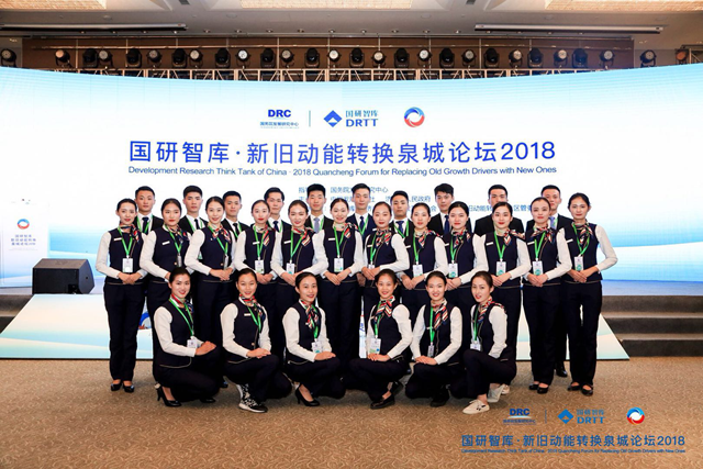 10月13日,由国务院发展研究中心指导,中国发展出版社和济南市政府共同主办的“国研智库·新旧动能转换泉城论坛2018”在济南银丰华美达酒店举行。本届论坛主题为“改革开放四十周年与新旧动能转换”。国务院发展研究中心主任李伟致辞并作主旨演讲。省委常委、济南市委书记王忠林,副省长于国安分别致辞。论坛由济南市委副书记、市长孙述涛主持。来自学校旅游学院空中乘务专业的30名学生在刘莹老师的带领下全程参与了本届论坛的志愿者服务工作,他们以其良好的形象、优雅的礼节、诚挚的热情,成为了会议一道靓丽的风景线。