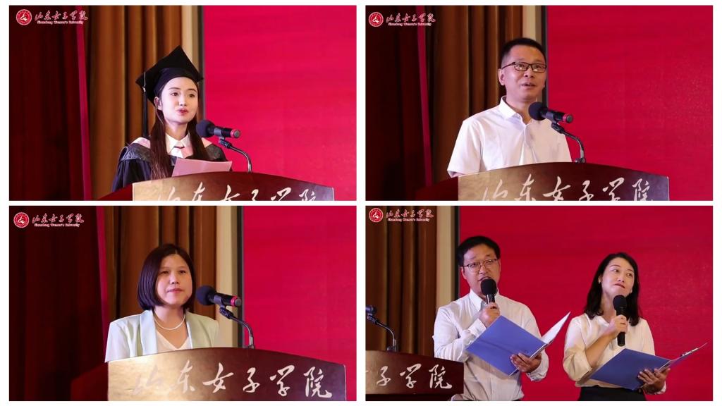 毕业生代表外国语学院商务英语专业毕业生张明欣向学校、老师和同学们表示了衷心的感谢与祝福,回忆了四年大学时光,表示未来将肩负起新时代青年应有的责任和担当。教师代表社会与法学院教师苏海向毕业生表达了感谢与祝福,并希望毕业生与历史、现在、未来建立关联,有历史感、实践感、创新感,不忘来路,用脚丈量前路,用梦想铺就未来之路。校友代表教育学院2005级学生李凤燕回忆了在母校学习的时光,寄语学弟学妹们要以梦为马、不负韶华,肩负使命、砥砺前行,为母校创造更大的荣光。传媒学院教师陈亮、李攀深情朗诵了原创诗歌《我亲爱的孩子,再见》。