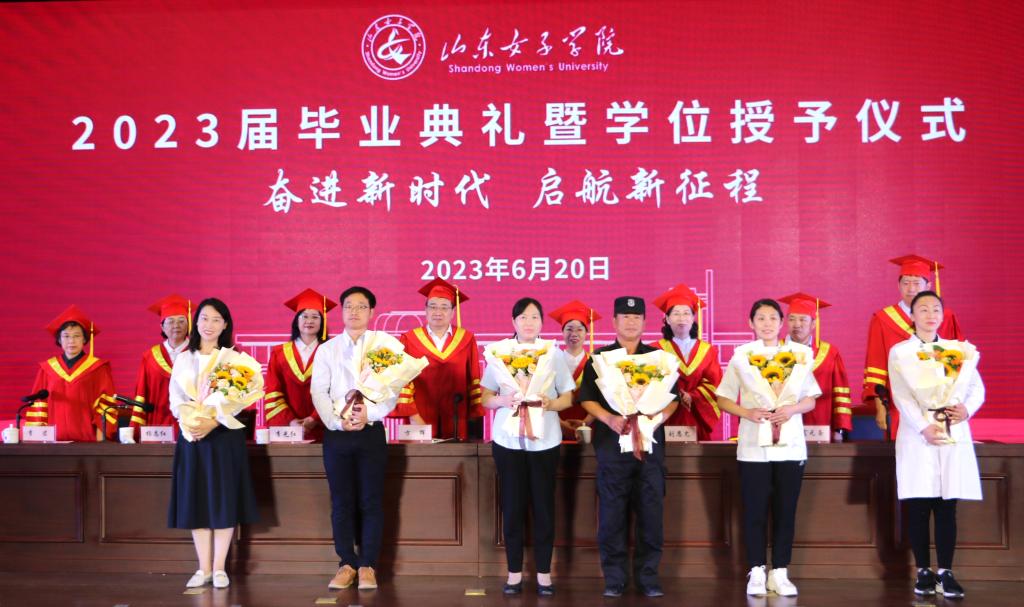 毕业生代表向保卫、后勤、宿管等岗位上的工作人员代表献花表达谢意。典礼在全体师生合唱《山东女子学院校歌》的歌声中落下帷幕。典礼开始前,学校大学生艺术团为全体毕业生精心编排了精彩纷呈的开场节目中,寄托对毕业生的依依不舍,表达了对毕业生的美好祝愿。