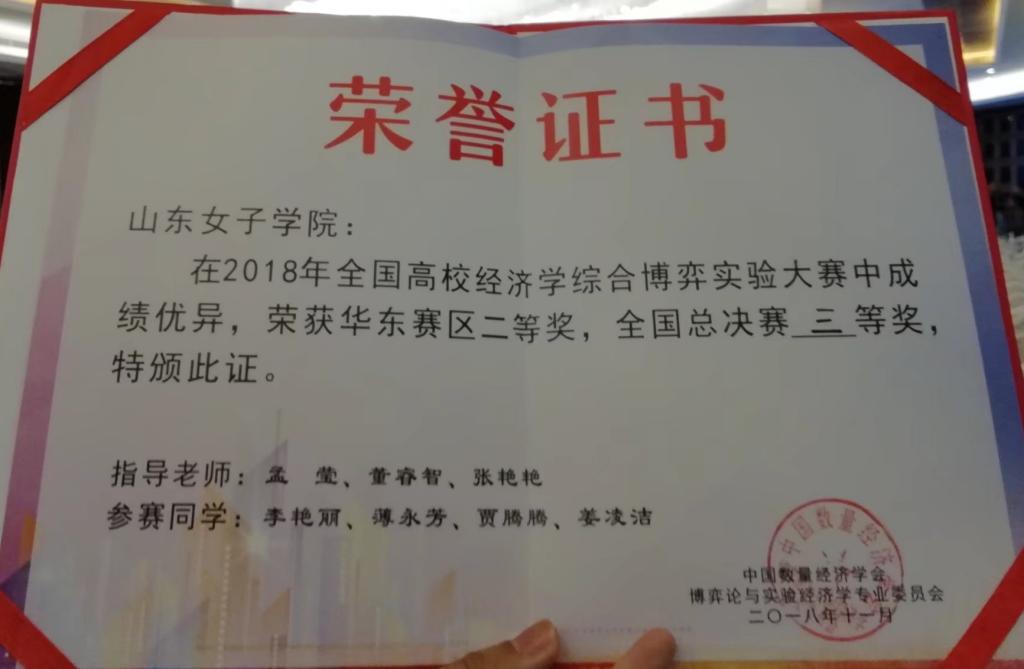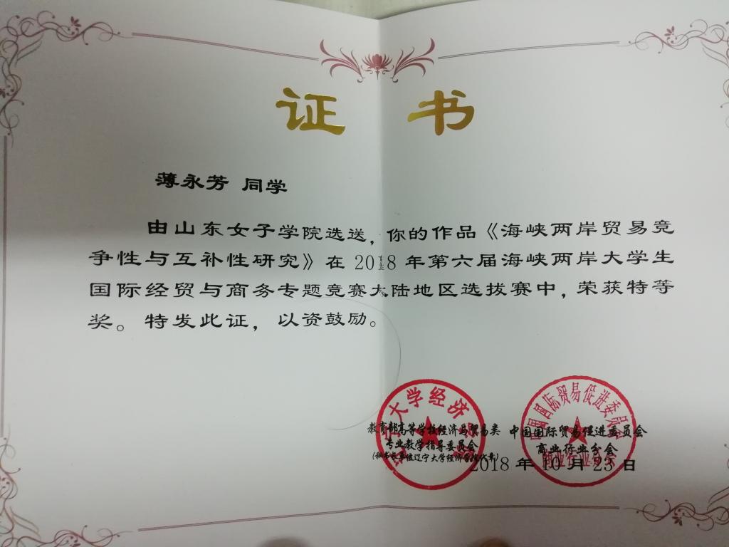 在“山东大学生科技艺术节跨境电商创新实践大赛”中获得总决赛一等奖,在“海峡两岸大学生国际经贸与商务专题竞赛”中获得特等奖,在“全国大学生数学建模竞赛”中获得省级一等奖,在“POCIB全国外贸从业能力大赛”中获得三等奖,在“全国高校经济学综合博弈实验大赛”中获得总决赛三等奖。