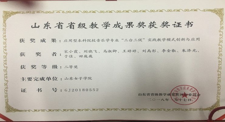 其中《声乐》课被评为省级一流课程、山东省省级精品课;《声乐》微课比赛获国家教育部优秀奖、山东省微课比赛一等奖。师生在省部级专业赛事中获奖15余项。