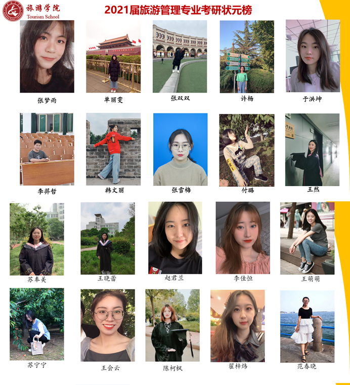 优质就业率达95%以上,上线升研率达70%,考取北京林业大学、北京交通大学、安徽大学、海南大学、内蒙古大学、华南师范大学等985、211高水平大学研究生。在旅游企事业单位、旅游电子商务平台、政府部门及相关教育培训机构等从事经营、管理、策划、咨询、服务等工作,如北京公务员、河北选调生、黄山武装部文员、中国农业银行经理、博物馆馆员、人民教师等。涌现出一大批优秀的旅游行业从业者代表,如在线旅游公司经理、国际领队、国际邮轮乘务员、全国万名旅游英才“金牌导游”、省金牌导游、旅游大数据分析师、市场调研专员、研学导师、新媒体运营专员、旅游定制师、旅游体验分析师等佼佼者,收获无数好评。