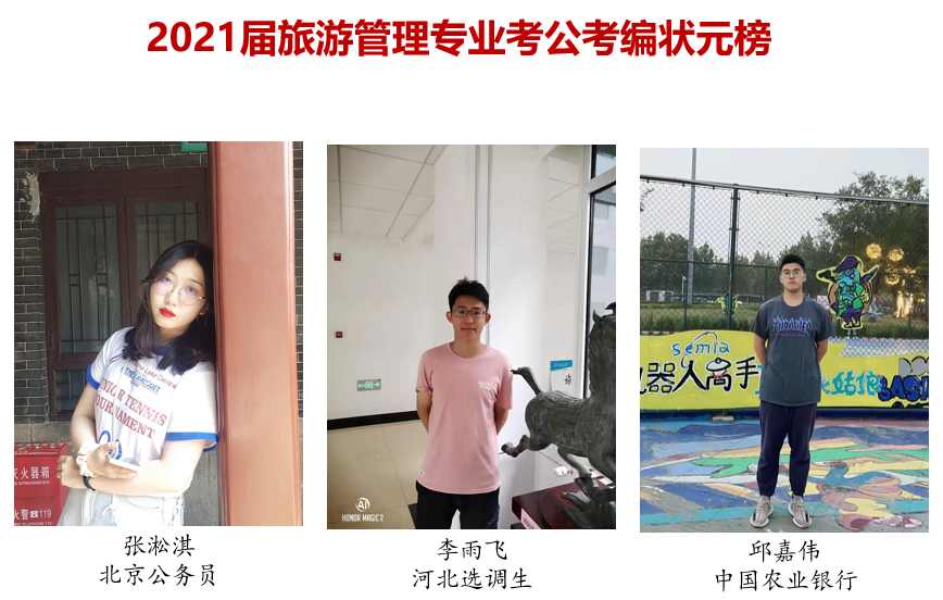 优质就业率达95%以上,可在旅游行政管理部门以及文旅集团、线上旅游公司、旅行社、旅游景区及相关教育培训机构等行业从事管理员、旅游大数据分析师、市场调研专员、研学导师、新媒体运营专员、旅游定制师、旅游体验分析师等;已有优秀毕业生考取北京林业大学、北京交通大学、安徽大学、海南大学、内蒙古大学、华南师范大学等985、211高水平大学研究生,考取北京公务员、河北选调生、黄山武装部文员、农业银行经理、博物馆讲解员、人民教师等。涌现出一大批优秀的旅游行业从业者代表,如在线旅游公司经理、国际领队、国际邮轮乘务员、全国万名旅游英才“金牌导游”、省金牌导游等佼佼者,收获无数好评。