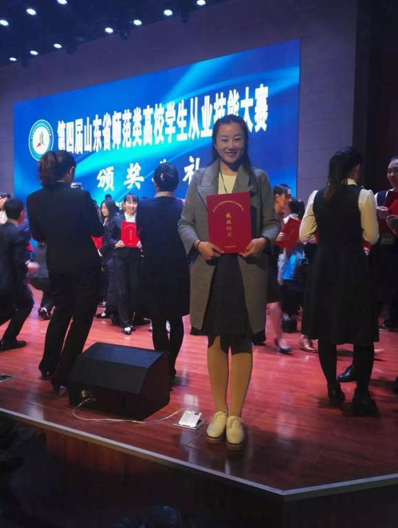刘金松,学前教育专业学生,山东省师范生从业技能大赛一等奖获得者,2017年毕业考取事业编进入省委机关幼儿园工作。